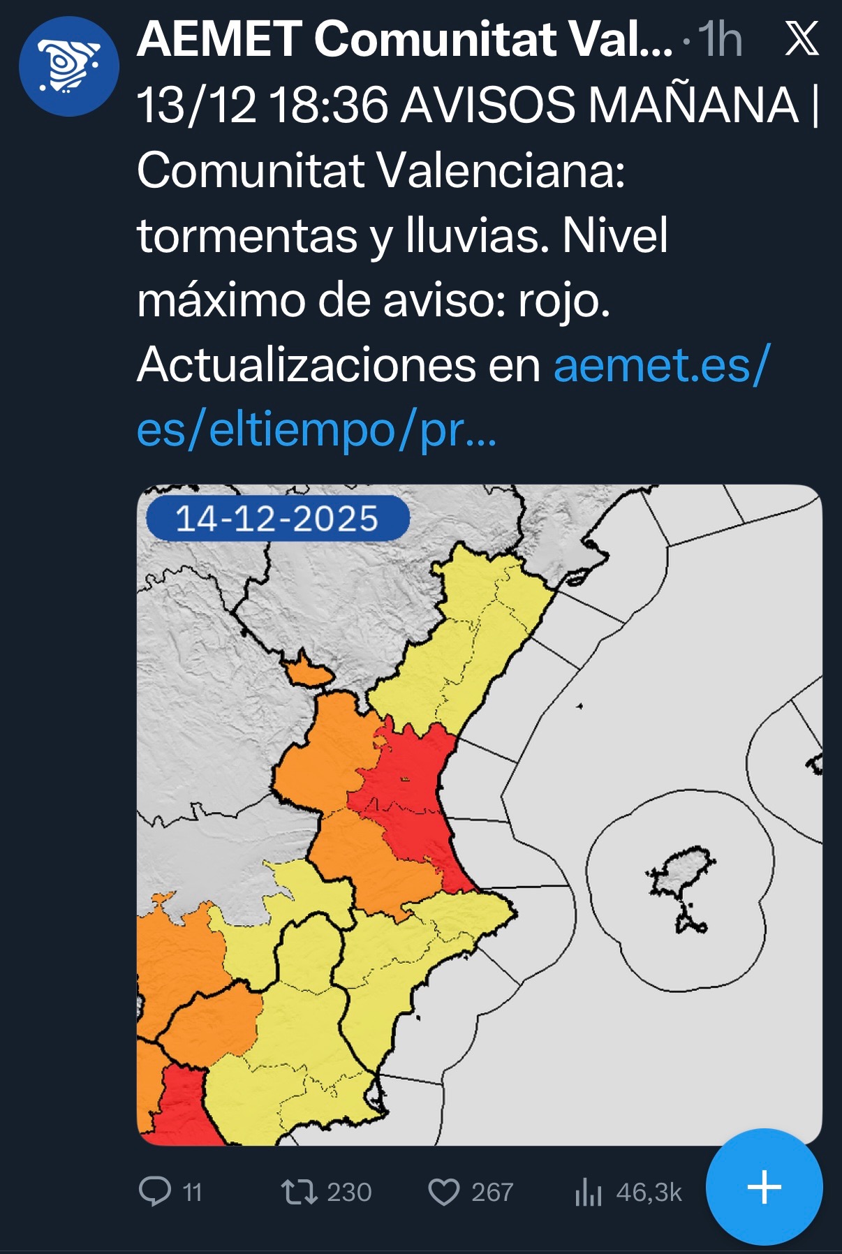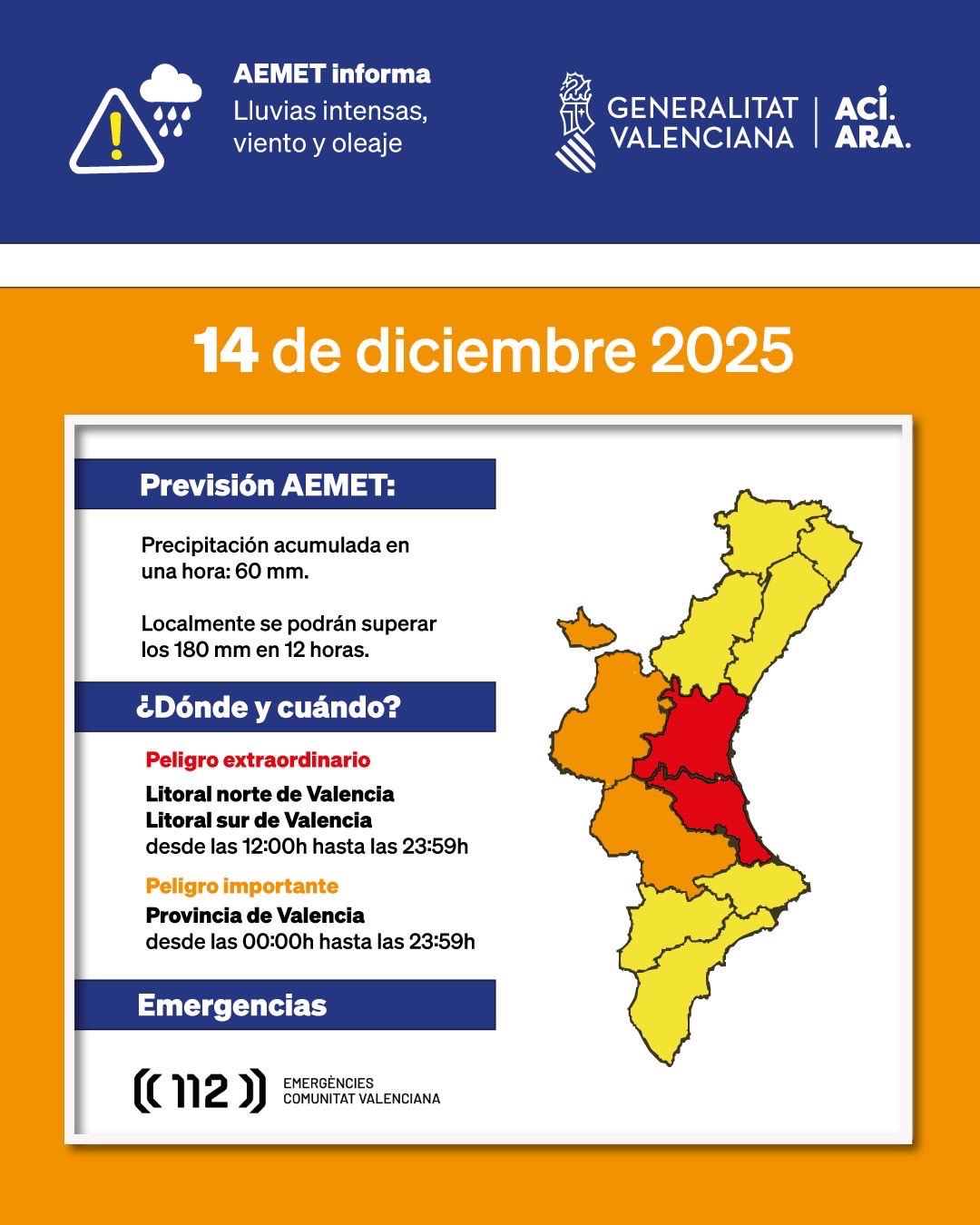 El Centro de Coordinación de Emergencias 112 GVA establece la siguiente alerta meteorológica para el domingo 14 de diciembre tras el aviso emitido por la AEMET: