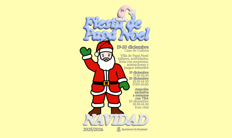 Como se ha señalado, Papá Noel también estará el sábado 20 de diciembre por la mañana en la Casa de Cultura. En este caso, la atención de este campechano personaje estará centrada en menores con TEA que tendrán la oportunidad de disfrutar de esta gran visita con una atención personalizada. En ese mismo horario se podrá acceder a todos los juegos y animaciones instalados en el Auditorio. Ya por la tarde, de 17.00 a 20.00 horas, nuevamente Papá Noel estará en el citado espacio municipal para que acudan las y los niños de Burjassot a visitarle.