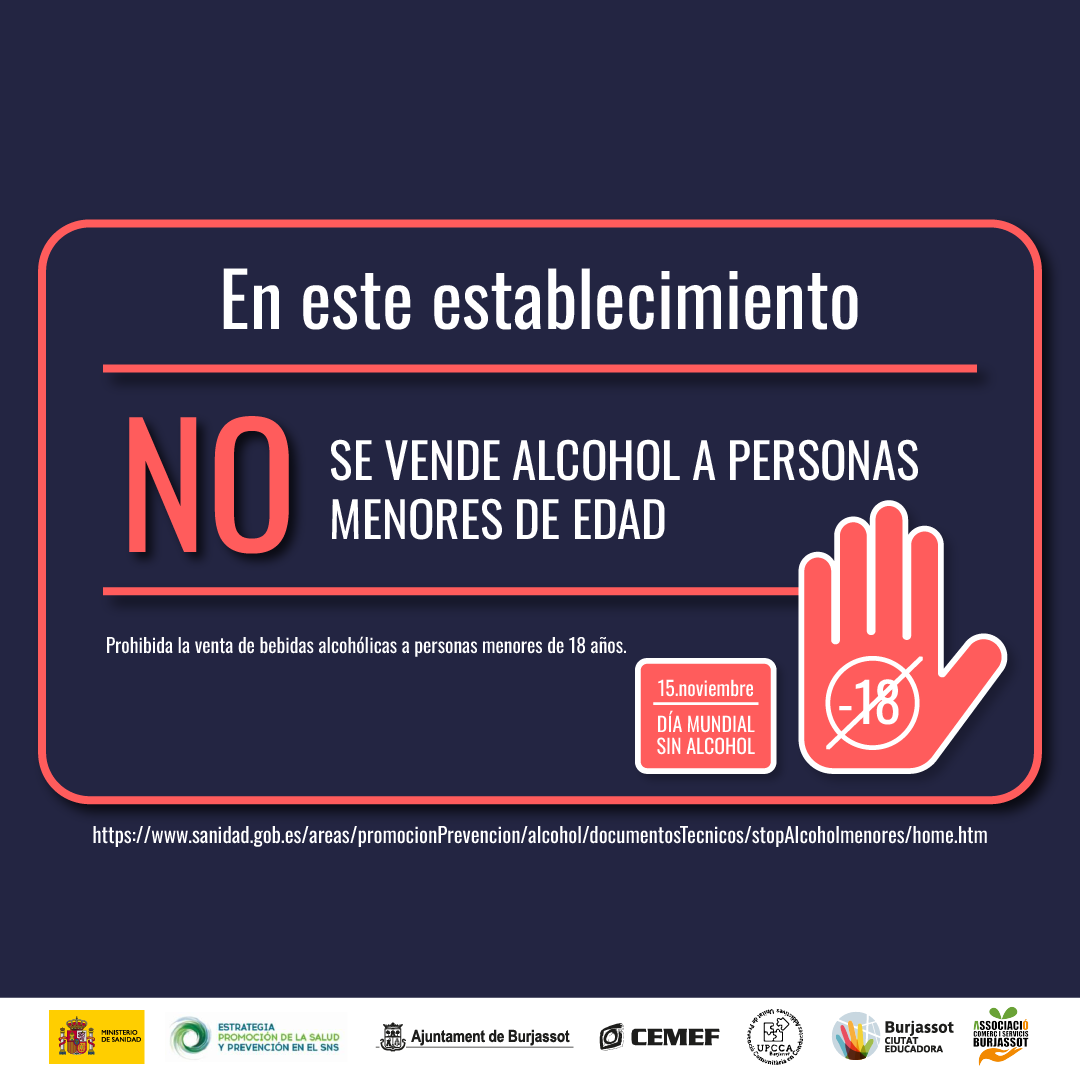 Con el objetivo de sensibilizar sobre la importancia de prevenir la venta y dispensación de alcohol a personas menores de edad, el Ayuntamiento de Burjassot se ha adherido a la campaña de conmemoración del Día Mundial sin Alcohol, lanzada desde el Ministerio de Sanidad. Lo ha hecho de manos de la Concejalía de Sanidad, dirigida por Isabel Mª Mora, a través de la Unidad de Prevención Comunitaria en Conductas Adictivas (UPCCA) y contando con la colaboración de la Concejalía de Comercio, dirigida por Rosa Coca, a través de CEMEF, y de la Asociación de Comerciantes y Empresarios del municipio.