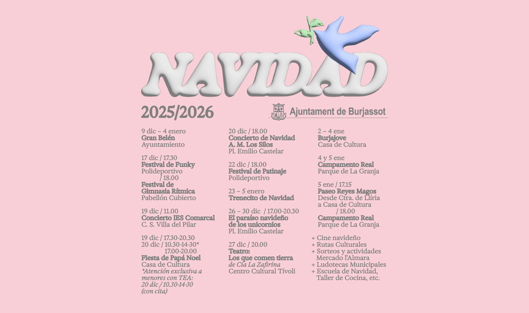 A todas estas actividades se une la programación cinematográfica de Navidad, las rutas culturales, festivales de deportes, los sorteos y actividades del Mercado Municipal l’Almara, la Escuela de Navidad Burjassot Concilia y la de la Casa de Cultura o el taller de cocina, entre otras muchas que van a hacer que Burjassot viva unas Navidades de ensueño preparadas con el mayor de los mimos y detalle por parte de todas las áreas municipales.