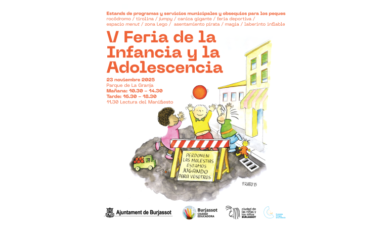 Será el domingo 23 de noviembre a partir de las 10.30 horas cuando el Parque de La Granja abra sus puertas a la V Feria de la Infancia y la Adolescencia, que llega al municipio de manos de la Concejalía de Protección y Derechos de la Infancia del Ayuntamiento de Burjassot, dirigida por Yolanda Andrés. Un domingo reivindicativo que llega tras la celebración, el jueves 20 de noviembre, del Día Mundial de la Infancia en el que también se conmemoran los aniversarios de la adopción de la Declaración Universal de los Derechos del Niño (1959) y la aprobación de la Convención de los Derechos del Niño (1989).