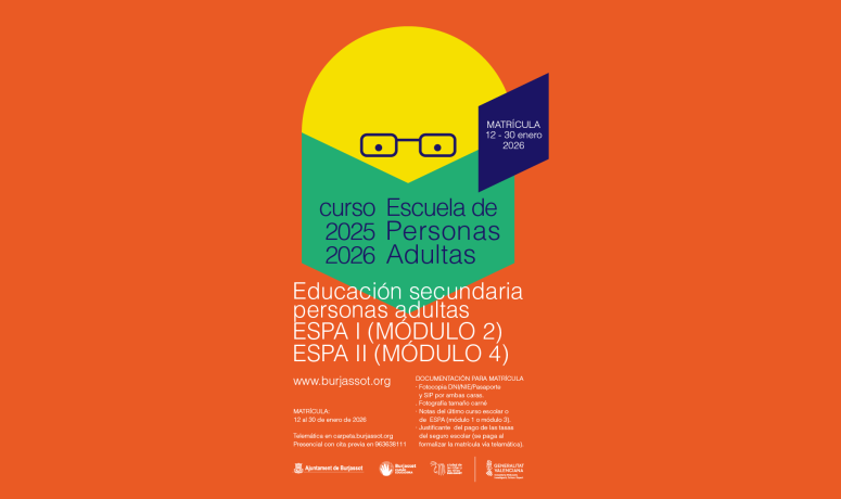 Las matrículas, para Educación Secundaria para Personas Adultas, ESPA I (Módulo 2) y ESPA II (Módulo 4), se podrán realizar de manera telemática, en la Carpeta Electrónica del Ayuntamiento de Burjassot, PINCHANDO AQUÍ, o bien de manera presencial en la propia Escuela de Adultos, c/ José Carsí, 10. En este caso, es necesario solicitar Cita Previa llamando al 96 363 81 11. La matrícula se entenderá completada y formalizada únicamente cuando se entregue toda la documentación en la Escuela de Adultos.