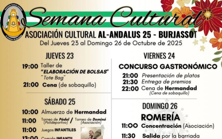 Del dijous 23 al diumenge 26 d’octubre, l’Associació Cultural Al- Andalus 25 de Burjassot celebrarà la Setmana Cultural, amb dies […]
