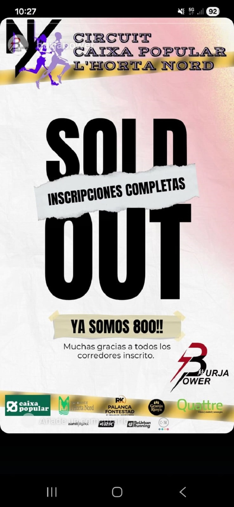 Tal és així, que dissabte passat, quatre dies abans de finalitzar les inscripcions, van haver de tancar-les en aconseguir els 800 inscrits, límit de la prova. Una gran satisfacció per al club burjassoter que espera que tot el municipi isca als carrers a animar a les corredores i els corredors, convençuts que Burjassot gaudirà d’un diumenge festiu en el qual també es comptarà amb la col·laboració de les comissions falleres, que tindran quatre punts d’animació i l’ajuda de quasi 100 voluntàries i voluntaris que faran possible que la carrera siga una festa del running.