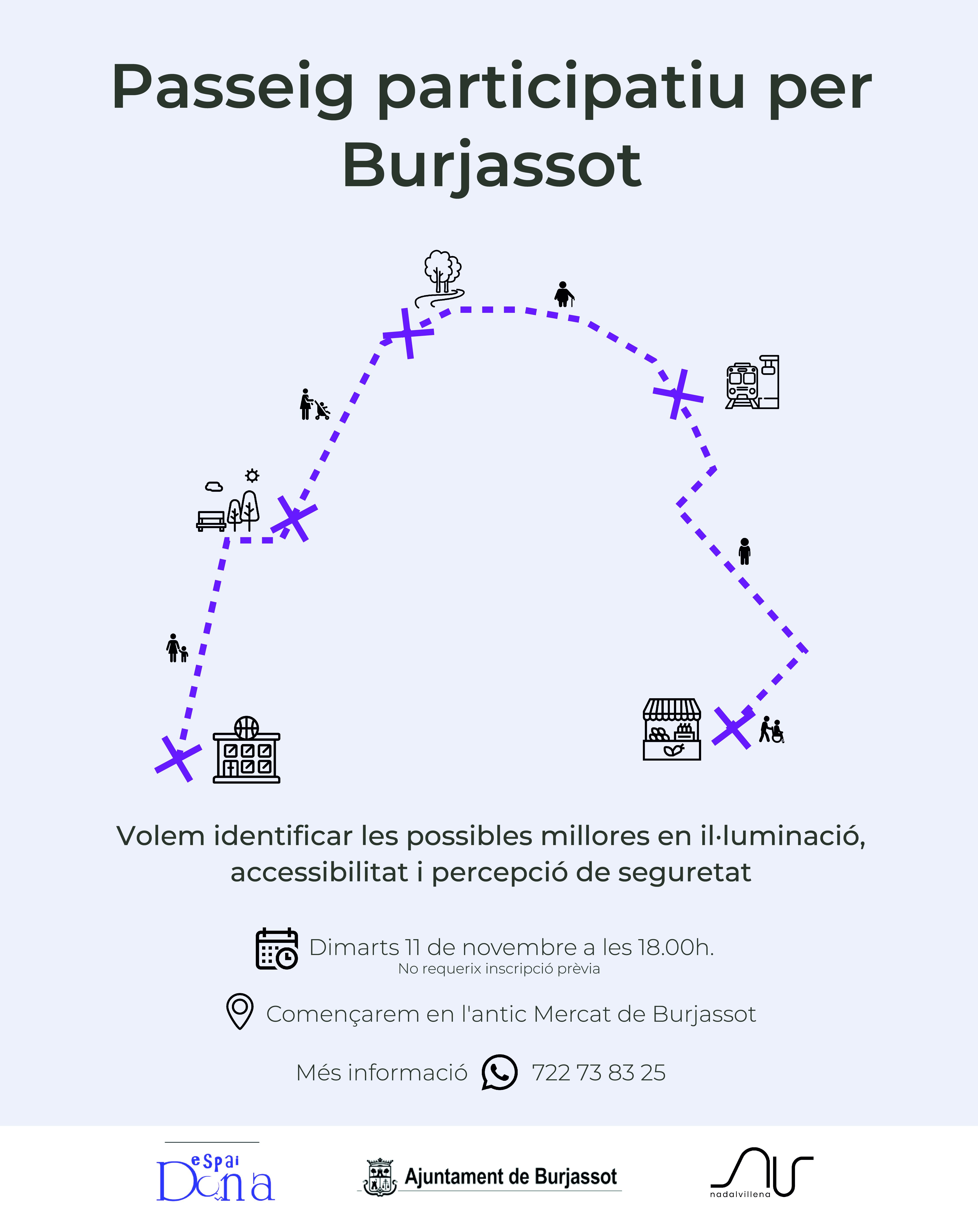 A més, per al pròxim dimarts 11 de novembre, a les 18.00 hores, s’ha programat un Passeig participatiu per Burjassot per a valorar l’accessibilitat, la il·luminació i la percepció de seguretat en l’entorn. L’eixida del mateix es realitzarà des de l’Antic Mercat (Plaça Baltasar Mallent). El passeig té com a objectiu que la ciutadania participe de manera activa en el desenvolupament d’una ciutat més còmoda i segura.