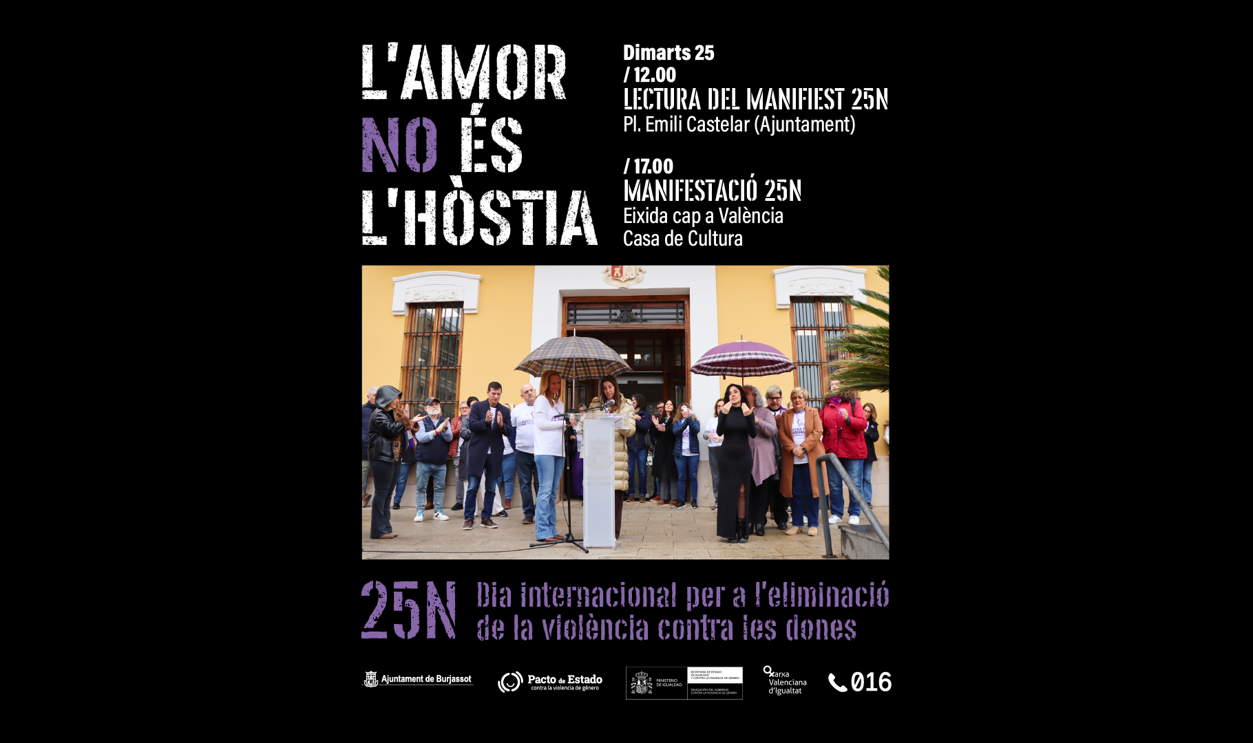 La porta de l’Ajuntament de Burjassot serà testimoni excepcional de la lectura del manifest reivindicatiu que commemora el Dia Internacional de l’Eliminació de la Violència contra la Dona, el 25 de novembre.
