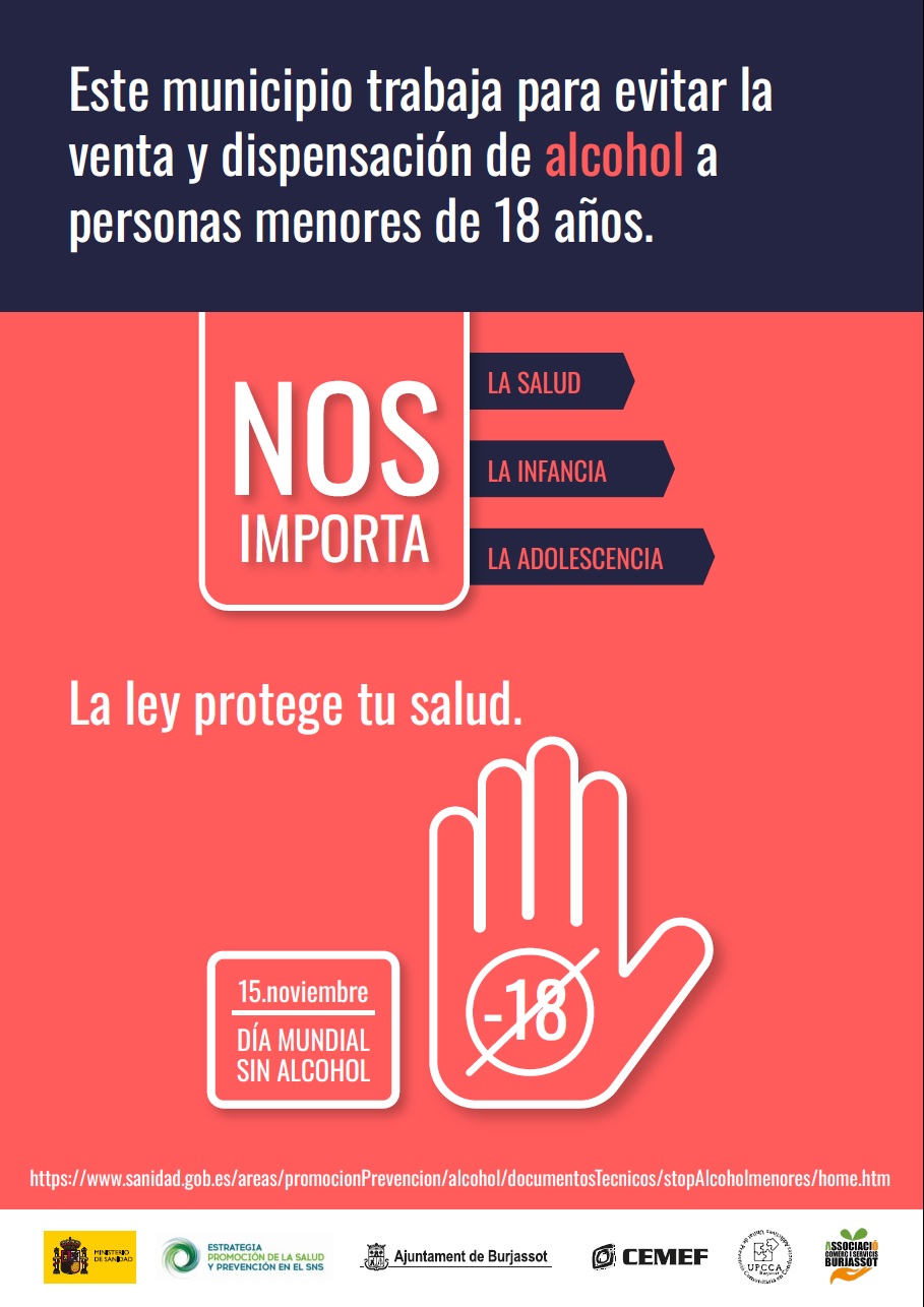 Amb l’objectiu de sensibilitzar sobre la importància de previndre la venda i dispensació d’alcohol a persones menors d’edat, l’Ajuntament de Burjassot s’ha adherit a la campanya de commemoració del Dia Mundial sense Alcohol, llançada des del Ministeri de Sanitat. Ho ha fet de la mà de la Regidoria de Sanitat, dirigida per Isabel Mª Mora, a través de la Unitat de Prevenció Comunitària en Conductes Addictives (UPCCA) i amb la col·laboració de la Regidoria de Comerç, dirigida per Rosa Coca, a través de CEMEF i de l’Associació de Comerciants i Empresaris de Burjassot.