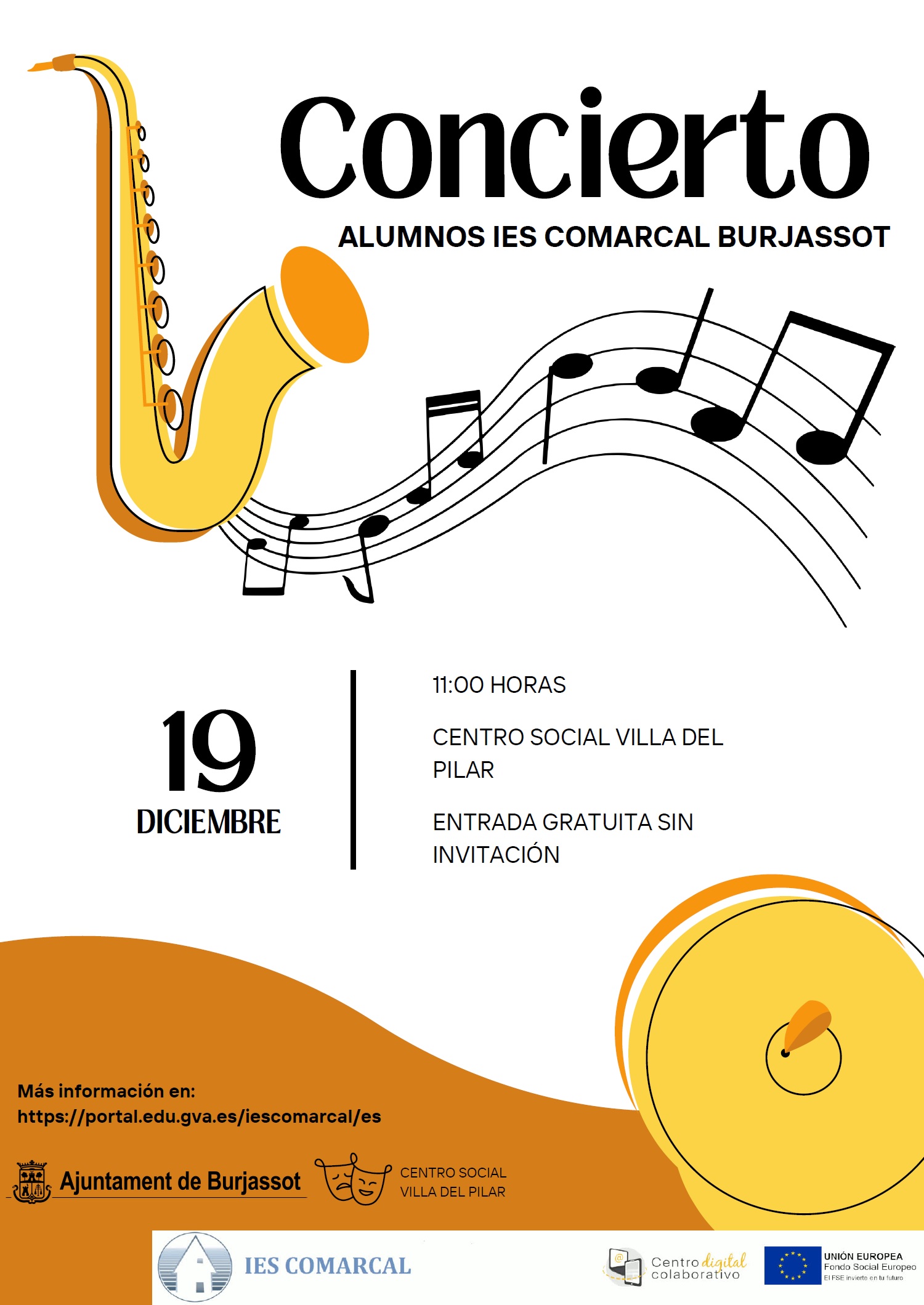 A partir de les 11.00 hores, i amb entrada gratuïta fins a completar aforament, l’alumnat del Comarcal oferirà este concert obert a tota la ciutadania i, especialment, a les usuàries i usuaris de la Vila del Pilar, en esta activitat intergeneracional que compta amb el suport de la Regidoria de Majors de l’Ajuntament de Burjassot, dirigida per Mª Ángeles Navarro.