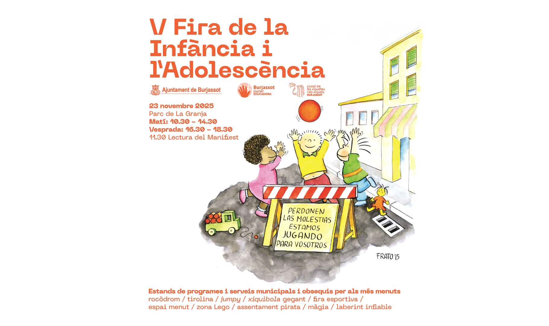Serà el diumenge 23 de novembre, a partir de les 10.30 hores, quan el Parc de La Granja òbriga les seues portes a la V Fira de la Infància i l’Adolescència, organitzada per la Regidoria de Protecció i Drets de la Infància de l’Ajuntament de Burjassot, dirigida per Yolanda Andrés. Un diumenge reivindicatiu que arriba després de la celebració, el dijous 20 de novembre, del Dia Mundial de la Infància en el qual també es commemoren els aniversaris de l’adopció de la Declaració Universal dels Drets del Xiquet (1959) i l’aprovació de la Convenció dels Drets del Xiquet (1989).