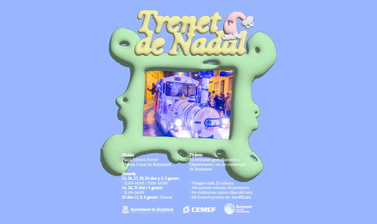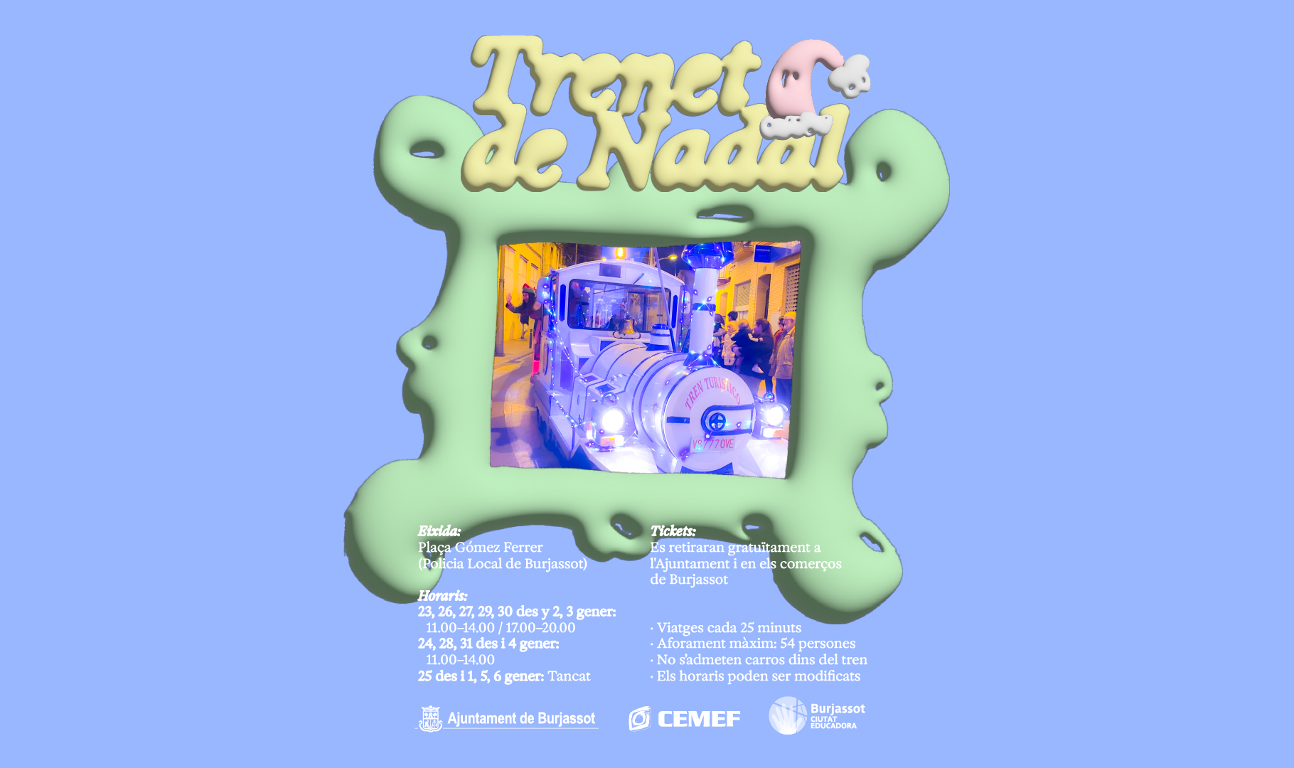 El màgic Trenet de Nadal arribarà a Burjassot el dimarts 23 de desembre. Un Trenet que, amb la seua típica música nadalenca i amb els seus follets que l’animen, fa que Nadal puga sentir-se des de tots els racons del municipi.