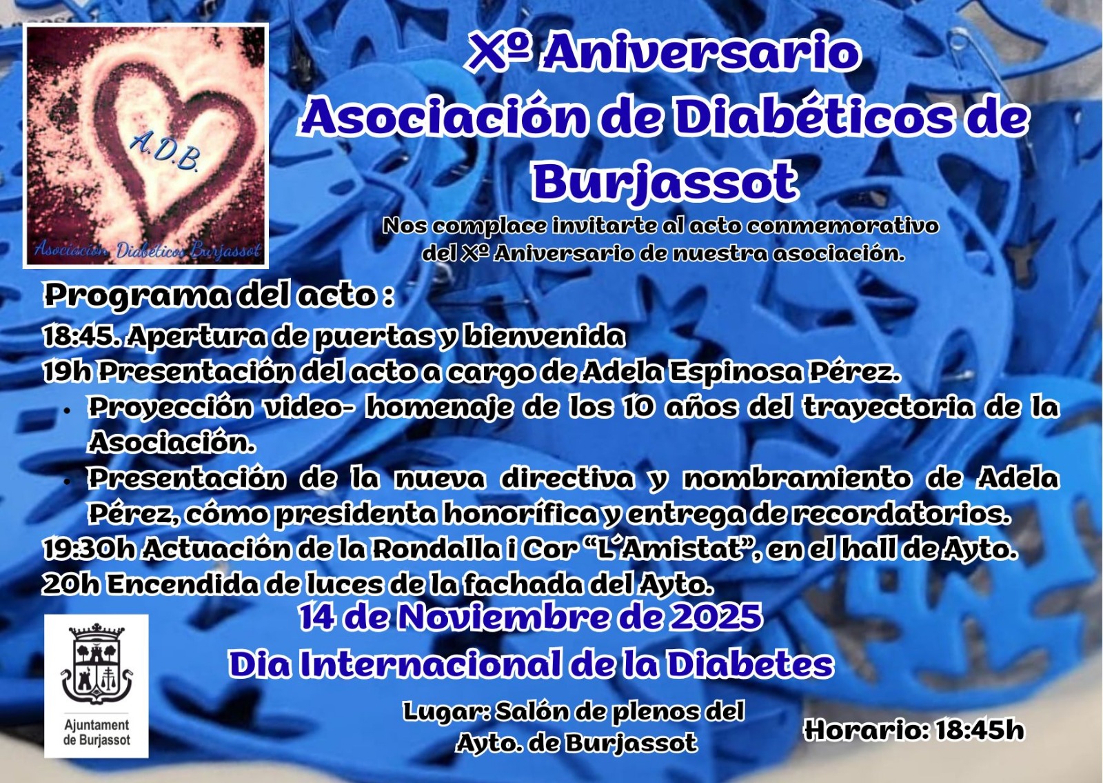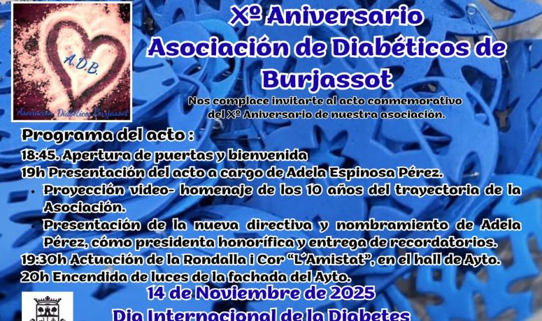 Eixa simbòlica data, la del 14 de novembre, ha sigut la triada per l’Associació de Diabètics de Burjassot (ADB) per a fixar la celebració del X aniversari de l’entitat, creada al novembre de 2015. Les activitats commemoratives començaran, no obstant això, el dimecres 12 de novembre, quan l’ADB instal·le una taula informativa, a la porta del Consistori, per a donar a conéixer la seua comesa a la ciutadania.