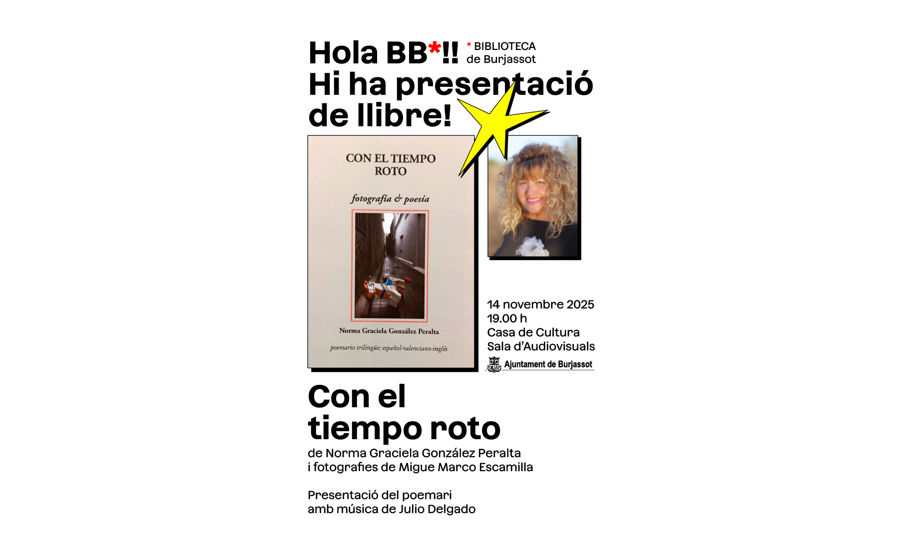 Nova setmana d’animacions lectores i d’activitats de foment de la lectura a Burjassot de la mà de les Biblioteques Municipals. El divendres 14 de novembre, la poesia serà la protagonista de la vesprada amb la presentació del poemari de Norma González, Con el tiempo roto, un homenatge a l’horta valenciana en el qual entremescla poesies i les fotografies de Migue Marco Escamilla. La presentació tindrà lloc a les 19.00 hores a la Casa de Cultura, on els assistents també podran veure les fotografies de Migue.