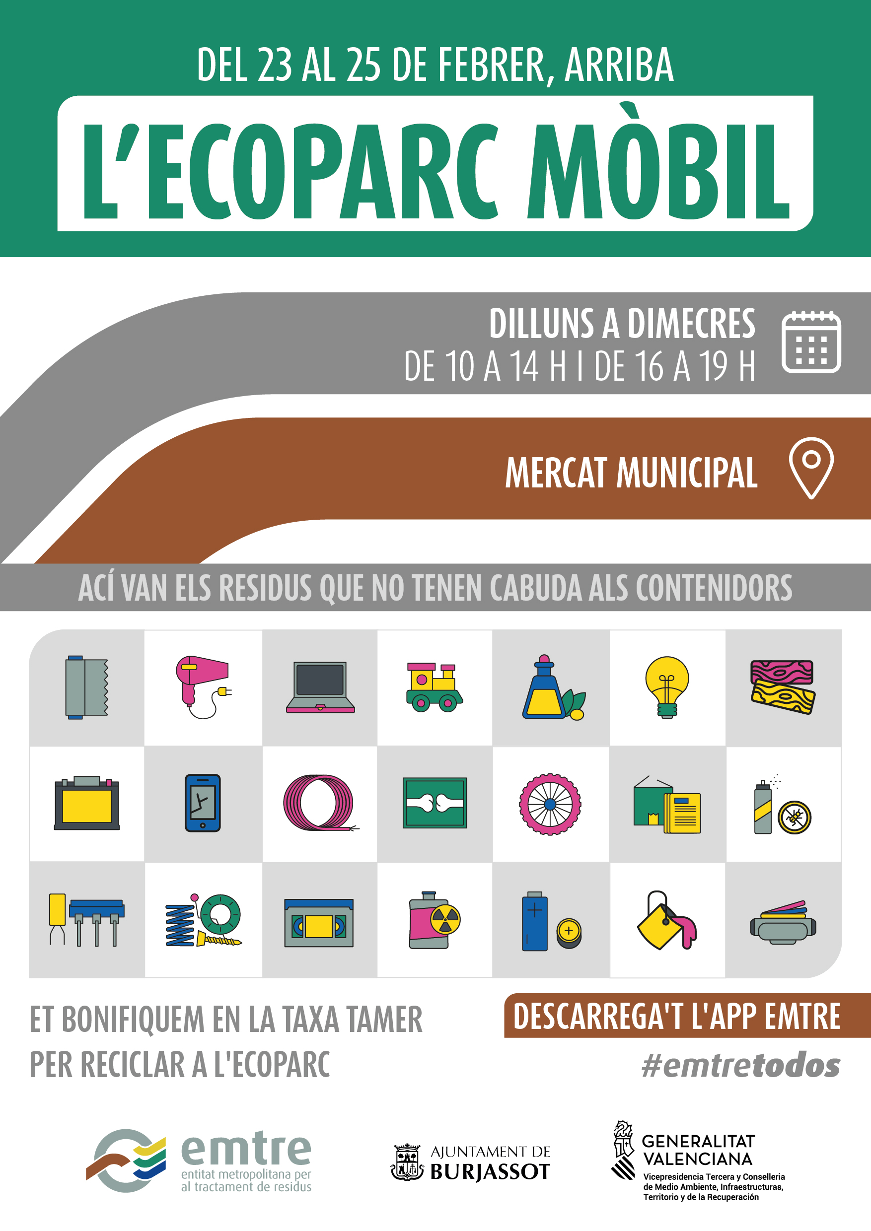 Los Ecoparques móviles de la Emtre son instalaciones de recogida selectiva de residuos que tienen la finalidad de acercarse a la ciudadanía para facilitarle, en todo lo posible, el reciclaje correcto de los residuos que se generan en los hogares. Dichas instalaciones llegan a Burjassot gracias al trabajo de la Concejalía de Medio Ambiente, dirigida por Estefanía Ballesteros.