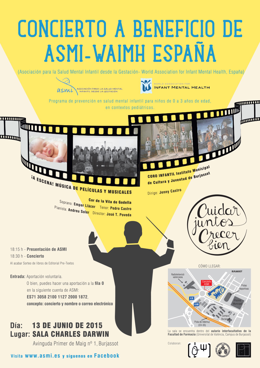 El Coro Infantil del Instituto Municipal de Cultura y Juventud de Burjassot, dirigido por Jenny Castro y el Cor de la Vila de Godella, bajo la dirección de José T. Poveda, unirán sus voces para cantar, en el marco de un concierto solidario, a beneficio de ASMI-WAIMH España, una asociación que trabaja por la salud mental infantil desde la gestación. El concierto se celebrará el próximo sábado, 13 de junio, a les 18:15h, en la Sala Charles Darwin, ubicada en la Facultad de Farmacia, en el Campus Universitario de Burjassot (Av. Primero de Mayo, 1).