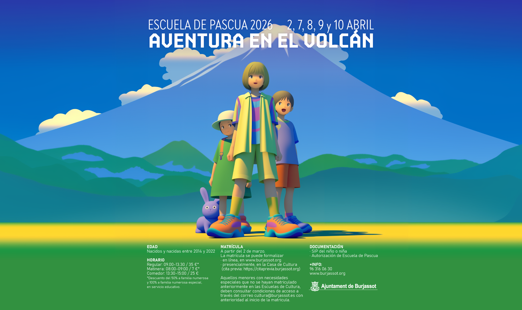 El Ayuntamiento de Burjassot va a dar la oportunidad a las y los peques del municipio y a los jóvenes de disfrutar de sus vacaciones de Pascua siendo parte de la Escuela de Pascua 2026 que llega con el lema Aventura en el volcán y que se desarrollará los días 2, 7, 8, 9 y 10 de abril en la Casa de Cultura del municipio.