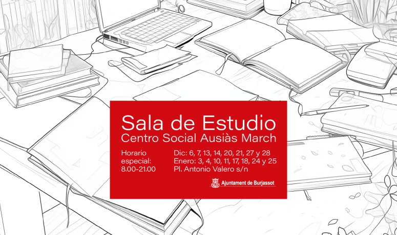 Con el objetivo de ayudar a las y los jóvenes en la preparación de sus exámenes, el Ayuntamiento de Burjassot va a abrir, desde este mismo fin de semana, días 6 y 7 de diciembre, la sala de estudio del Centro Social Ausiàs March en horario de 08.00 a 21.00 horas de manera ininterrumpida.