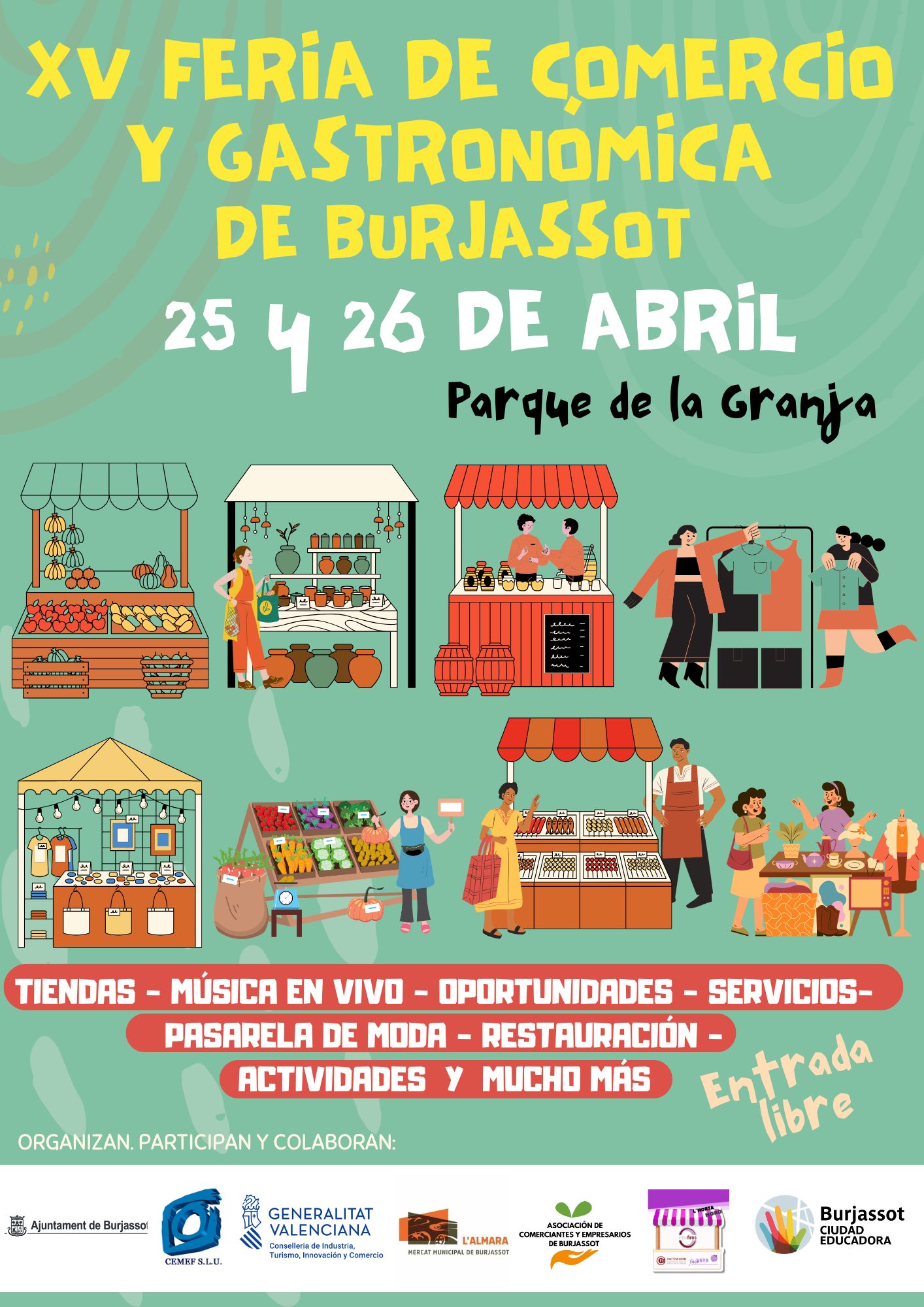 El fin de semana del 25 y el 26 de abril, la XV Feria de Comercio y Gastronómica de Burjassot va a ser la protagonista de la programación social del municipio; una feria que llega de manos del Ayuntamiento de Burjassot, a través de la Concejalía de Comercio y Mercados, dirigida por Rosa Coca, de manos de CEMEF y contando con la colaboración de la Asociación de Comerciantes y Empresarios de Burjassot y de Codemer, la asociación que aglutina a los puestos del Mercado Municipal l’Almara.