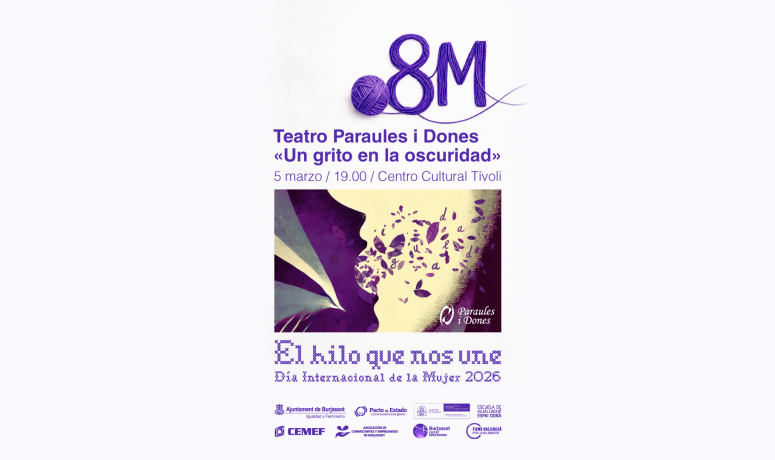 La programación del Ayuntamiento de Burjassot, con motivo del Día Internacional de la Mujer, impulsada por la Concejalía de Igualdad y Feminismo y en 2026 bajo el lema 8M, el hilo que nos une, reserva cada año un espacio destacado para el teatro. Fiel a esa cita, l’Associació Teatral Paraules i Dones vuelve a subir al escenario del Centro Cultural Tívoli con una nueva propuesta escénica: Un grito en la oscuridad. La representación tendrá lugar el jueves 5 de marzo, a las 19.00 horas, con entrada gratuita y libre, hasta completar aforo.