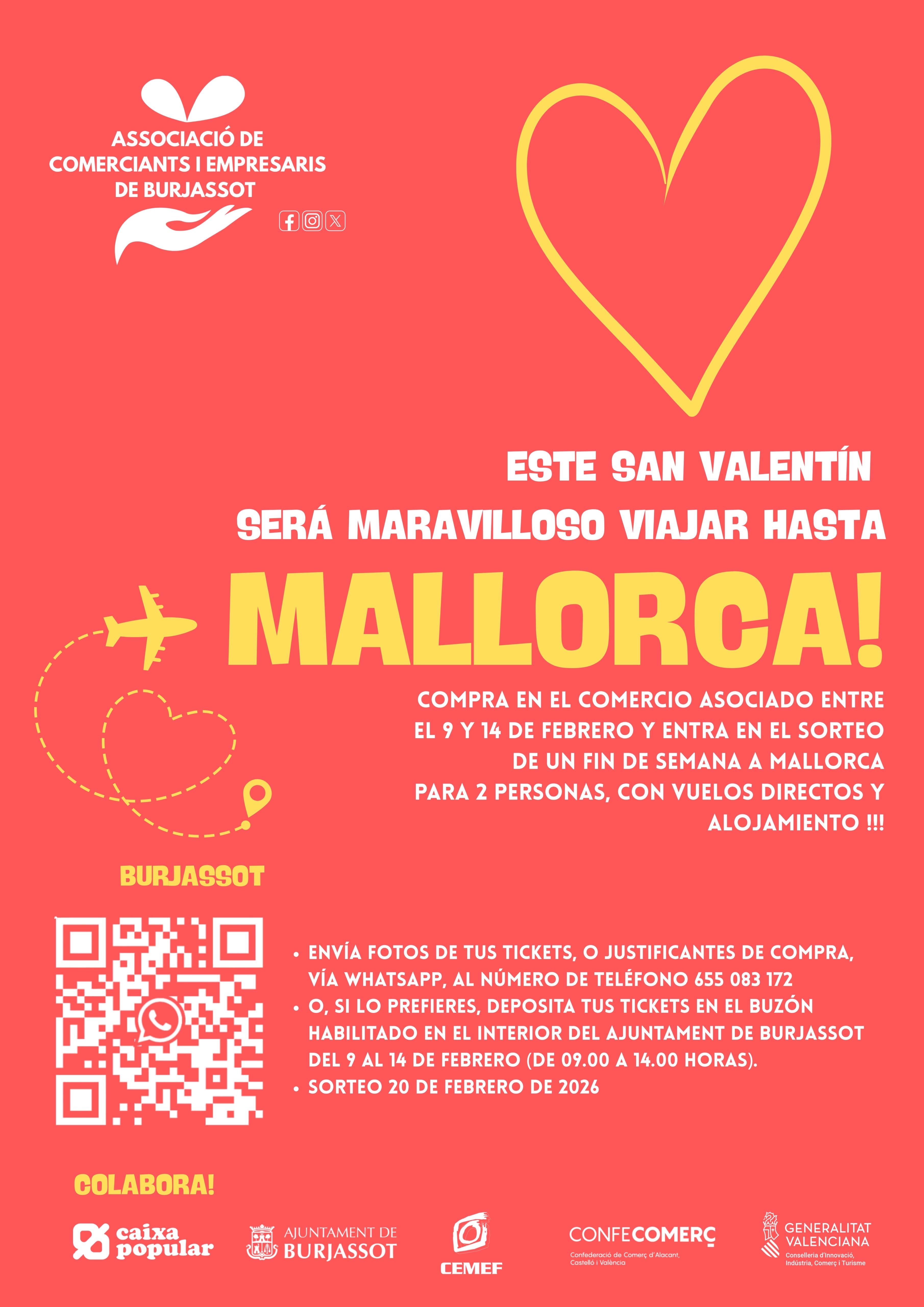 Sant Valentí portarà fins a Mallorca a una parella afortunada. L’Associació de Comerciants i Empresaris de Burjassot, amb la col·laboració de la Regidoria de Comerç, dirigida per Rosa Coca, i CEMEF, l’empresa pública municipal, ha llançat una nova campanya de foment del comerç local que té, com a premi, un viatge de cap de setmana a Mallorca per a dos persones (vols directes des de València i una nit d’hotel).