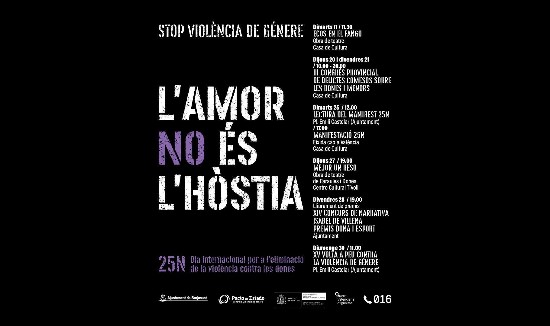Enguany, sota el lema L’amor no és l’hòstia, les activitats comencen el dimarts 11 de novembre amb l’obra de teatre Ecos en el fango, porogramada per als instituts del municipi. L’obra explora la violència masclista en l’àmbit familiar, on les experiències de maltractaments i abusos cap a la dona desborden la noció de “violència de gènere”, ja que afecten i influeïxen en els fills i filles. La representació posa el focus en les vivències de les xiquetes i xiquets que conviuen amb les agressions i que usen la imaginació i el joc com a refugi i resistència.