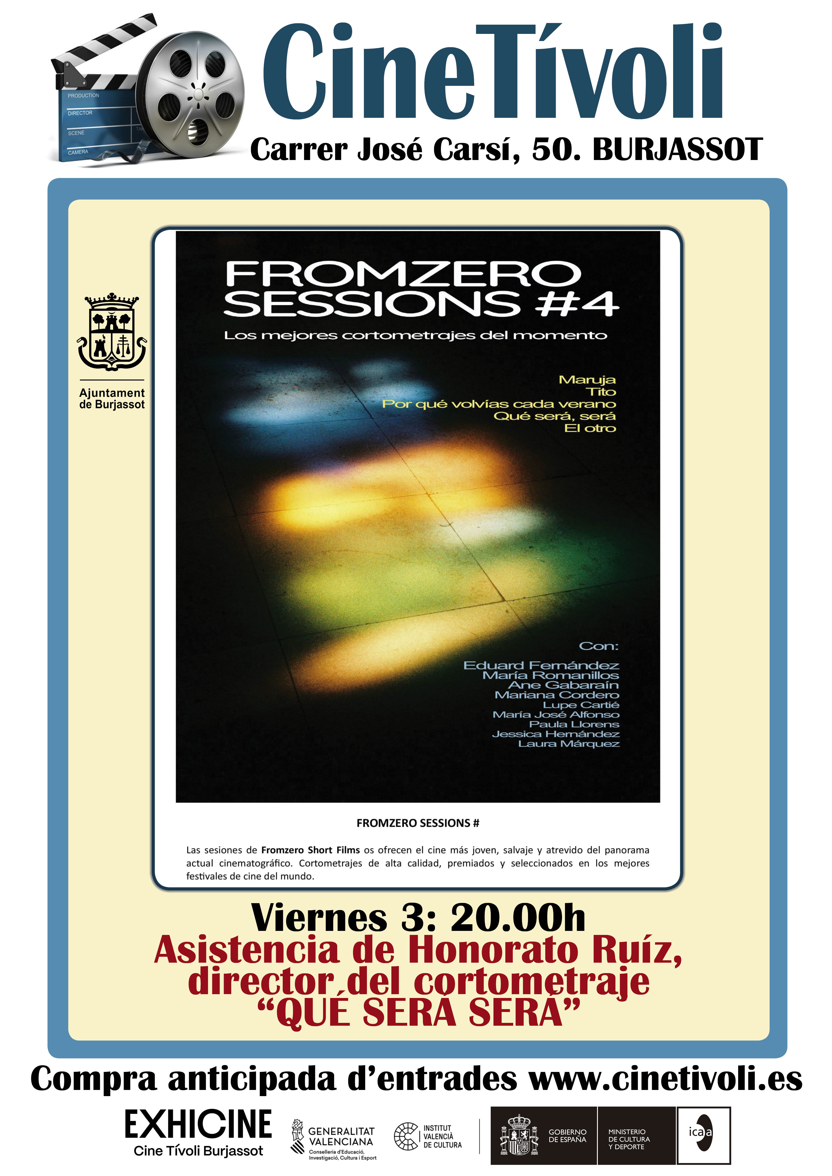 Finalment, el divendres 3 d’octubre, a les 20.00 h, els amants del curtmetratge podran gaudir d’una bona sessió de curts amb Fromzero Sessions 4. Concretament, es projectaran els següents curtmetratges: Maruja; Tito; Por qué volvías cada verano; Qué será, será i El otro. A més, es comptarà amb la presència de Honorato Ruiz, director del curtmetratge Què serà, serà.