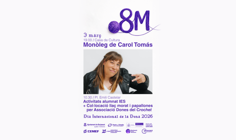 L’Ajuntament de Burjassot, a través de la Regidoria d’Igualtat i Feminisme que dirigix Yolanda Andrés, inicia dimarts que ve 3 de març la programació commemorativa del Dia Internacional de la Dona 2026, que enguany se celebra sota el lema 8M, el fil que ens unix.