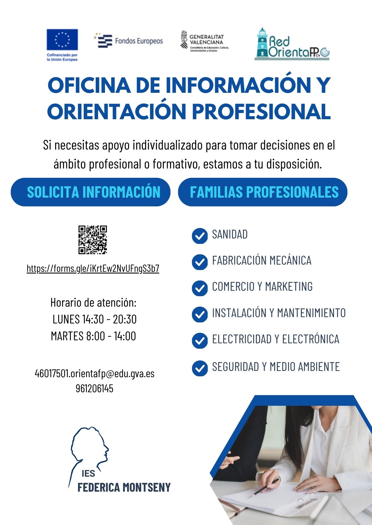 Pensant en això i a ser una ajuda per a l’alumnat i per a la ciutadania del municipi en general, l’IES Federica Montseny de Burjassot, formant part de la Xarxa OrientaFP- Horta Nord, disposa d’una Oficina d’Informació i Orientació Professional de la Formació Professional, un recurs gratuït d’orientació professional.