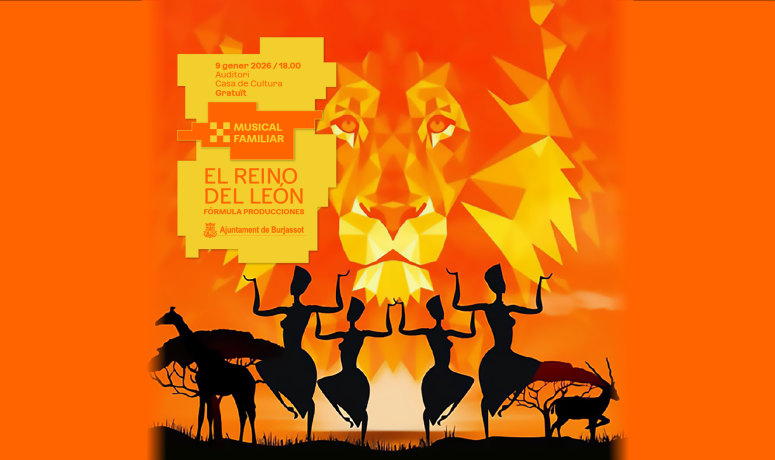 El divendres 9 de gener de 2026, a les 18.00 hores, l’Auditori de la Casa de Cultura de Burjassot acollirà El Reino del León, un musical familiar gratuït a càrrec de Fórmula Produccions. L’entrada serà lliure fins a completar aforament.