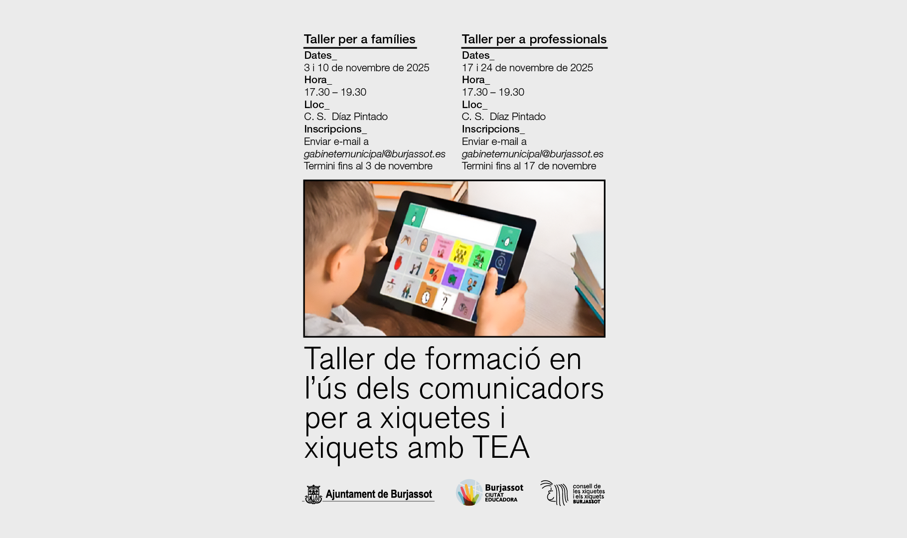 Amb esta proposta, l’Ajuntament de Burjassot reafirma la seua aposta per una educació inclusiva, accessible i adaptada a les necessitats de la infància amb TEA, proporcionant recursos útils tant a famílies com a professionals per a millorar la comunicació i l’acompanyament dels menors en la seua vida quotidiana.
