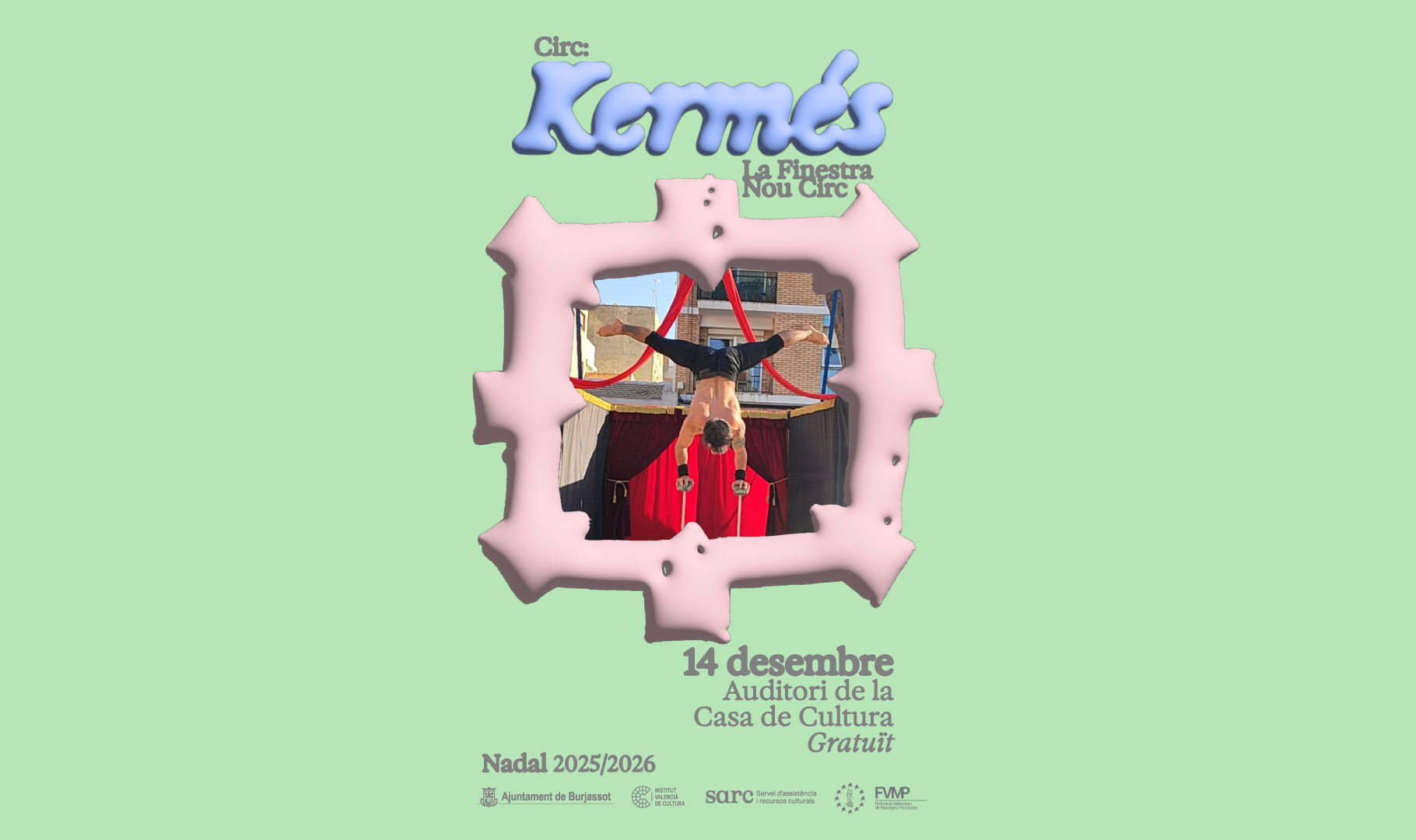 Kermés Circ arriba a Burjassot en el marc de la programació cultural de Nadal 2025/2026, organitzada per l’Ajuntament de Burjassot, a través de la regidoria de Cultura que dirigix Javier Naharros. La producció compta amb la col·laboració de l’Institut Valencià de Cultura (IVC), SARC – Diputació de València i la Federació Valenciana de Municipis i Províncies (FVMP).