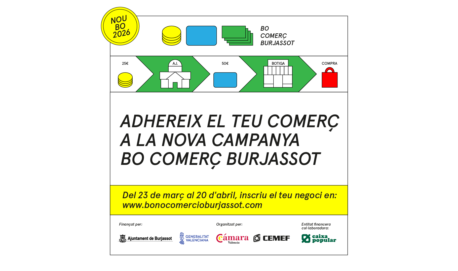 La campanya del Bo Comerç d’enguany es desenvoluparà entre el 21 d’abril, dia d’adquisició dels bons en la web www.bonocomercioburjassot.com i el 30 de juny, últim dia per a gastar els bons que, com en campanyes anteriors, tindran un valor de 50€ dels quals la ciutadania només pagarà 25€ ja que de la resta es fa càrrec l’Ajuntament de Burjassot. Cada ciutadà podrà comprar dos bons amb el que, amb un gasto de 50€ podrà fer compres fins a un valor de 100€.