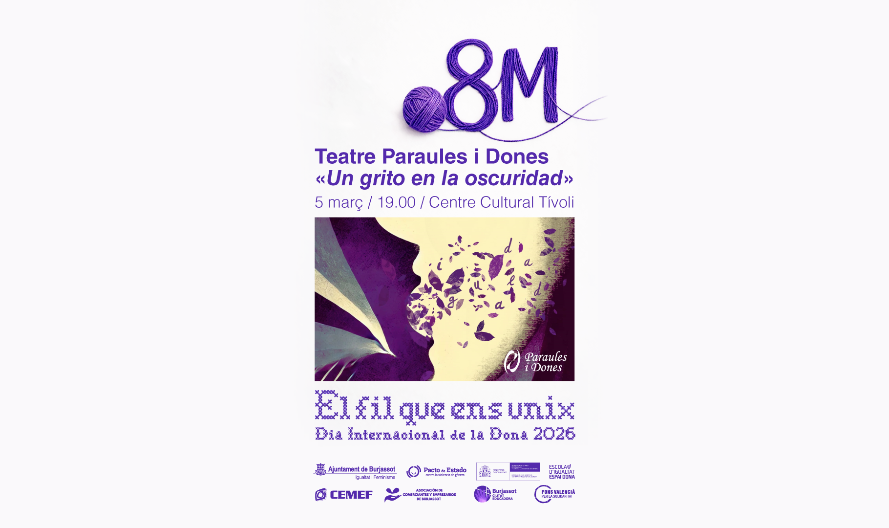 La programació de l’Ajuntament de Burjassot, amb motiu del Dia Internacional de la Dona, impulsada per la Regidoria d’Igualtat i Feminisme i en 2026 sota el lema 8M, El fil que ens unix, reserva cada any un espai destacat per al teatre. Fidel a eixa cita, l’Associació Teatral Paraules i Dones torna a pujar a l’escenari del Centre Cultural Tívoli amb una nova proposta escènica: Un grito en la oscuridad. La representació tindrà lloc el dijous 5 de març, a les 19.00 hores, amb entrada gratuïta i lliure, fins a completar aforament.