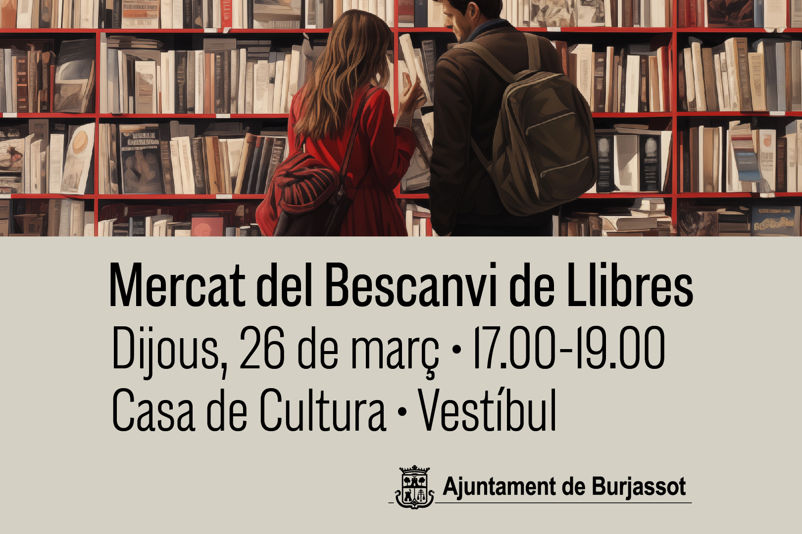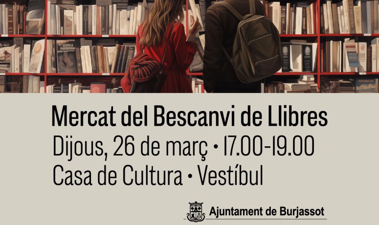 Març arriba a la seua fi i, com és habitual, l’intercanvi de llibres serà protagonista de les activitats de foment de la lectura de les Biblioteques Municipals de Burjassot. Com cada últim dijous de mes, el dia 26, hi ha una nova oportunitat per a intercanviar llibres a la Casa de Cultura.