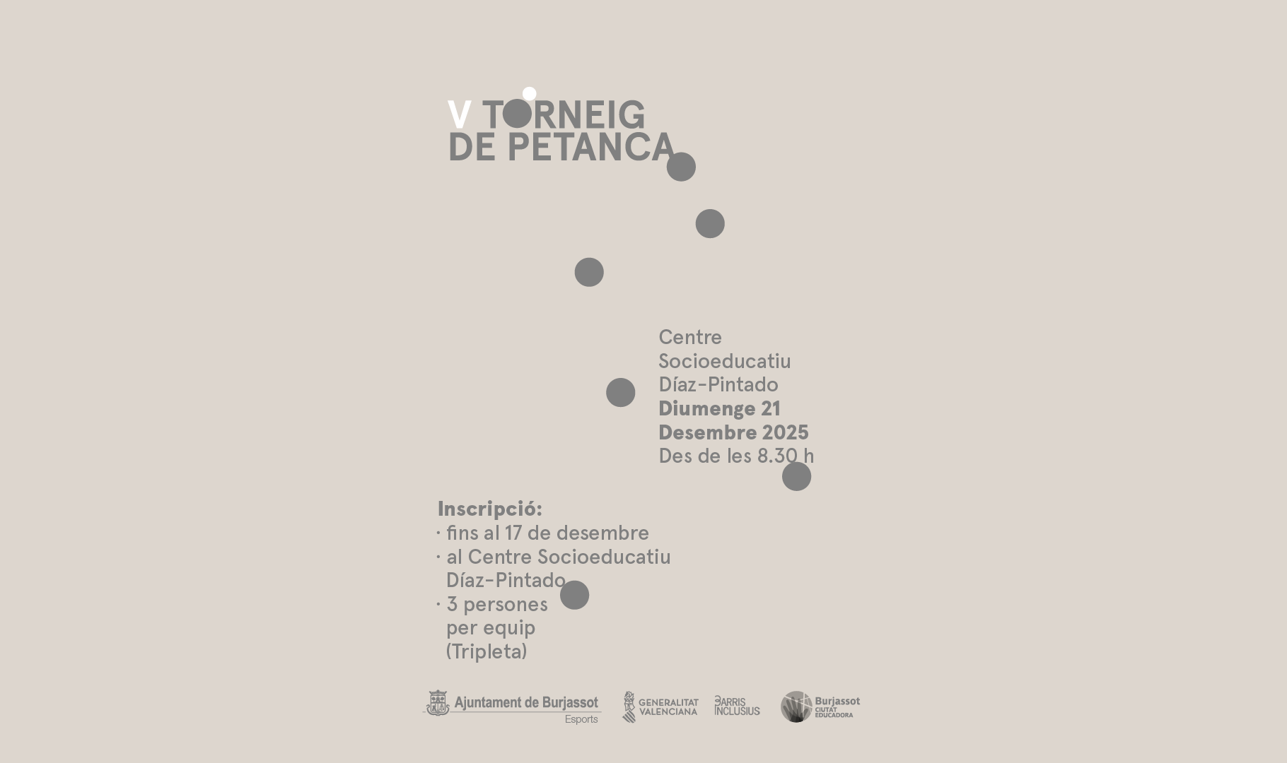 El Centre Socioeducatiu Díaz-Pintado de Burjassot acollirà, diumenge que ve 21 de desembre, la celebració del V Torneig de Petanca, una cita esportiva i de convivència que començarà a partir de les 08.30 hores. Les inscripcions romandran obertes fins al 17 de desembre i les persones interessades poden inscriure’s directament en el Centre Socioeducatiu Díaz-Pintado. El torneig està dirigit a equips formats per tres persones (tripletes).